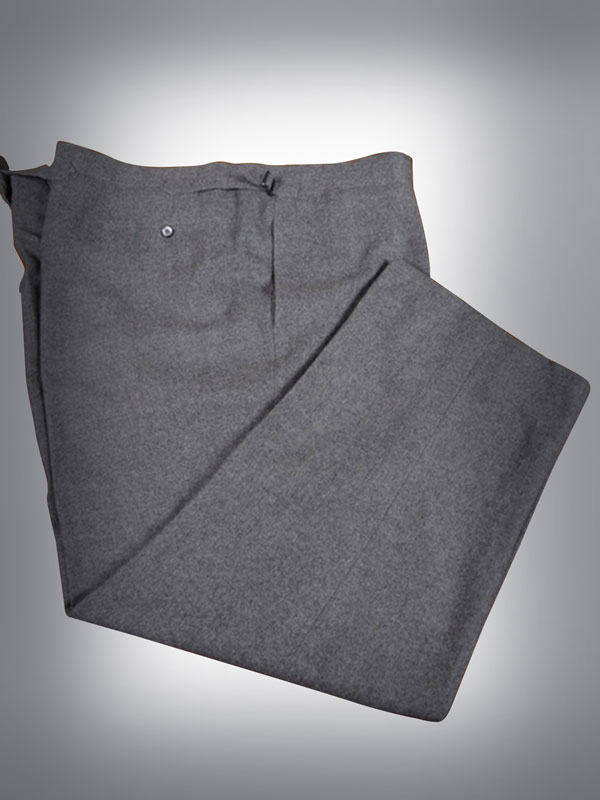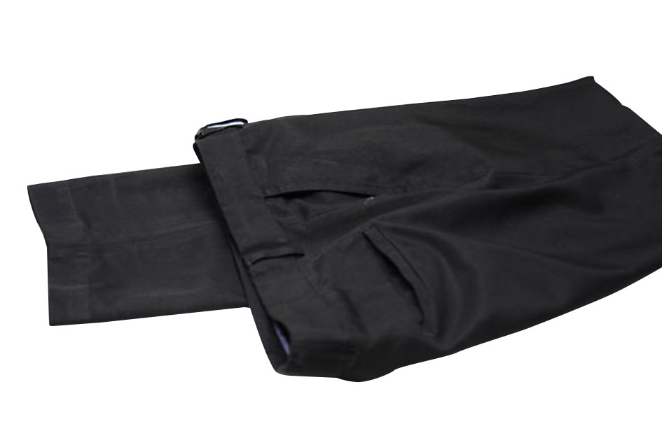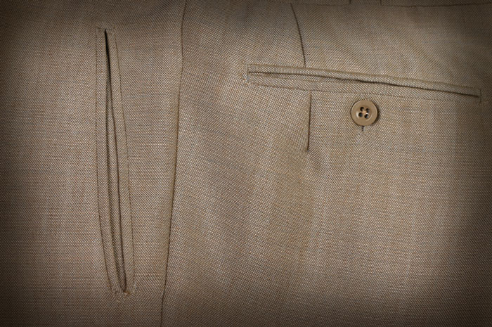 Horizontal slit back pockets are added to the trousers. Several adornments such as buttons or flaps are avoided in dress trousers at it appeals as more casual and avoiding these adornments gives a nice smooth draping at the back of the trousers which makes sitting down more enjoyable and comfortable. Of course it helps if men keep the pockets free of any items. Pockets filled with items tend to bulge even if it’s well-tailored.