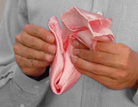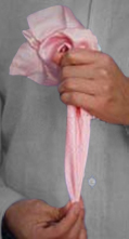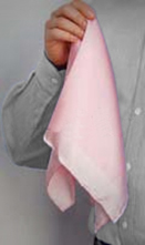 2. Next step is to make a ring using your thumb and index finger at the top of the pocket square with your other hand, underneath the pinch then pull it downwards thus creating a flute or column.