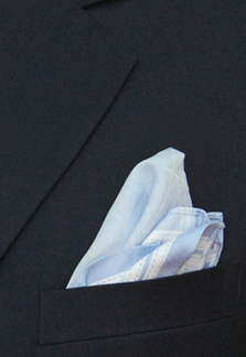 Maybe the most elegant type of pocket square is made of either linen or cotton in solid white square. The pocket square should be slightly starched to give it a bit of body. The white square is appropriate in many suit ensembles yet essentially works with dark colored basic suits.